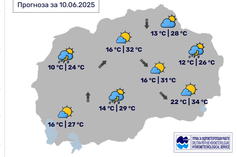 Денес, вторник, 10 јуни, во Битола, според прогнозите на метеоролозите на Управата за хидрометеоролошки работи, времето ќе биде сончево со умерена облачност. Попладне можност за нестабилна облачност со краткотраен пороен дожд и грмежи. Ќе дува слаб ветер од променлив правец. Температурата во Битола до 29 степени.