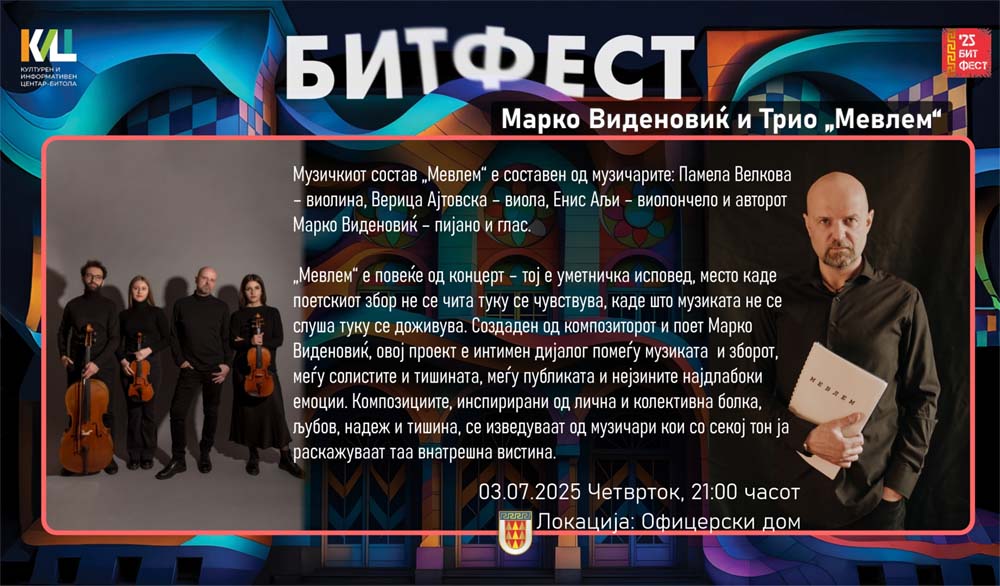 Битолското културно лето „БИТ ФЕСТ“, вечерва во Офицерскиот дом во Битола со почеток во 21:00 часот, ќе биде домаќин на прекрасна вечер во која музиката низ Проектот „Мевлем“ ќе зборува за љубовта, болката и надежта…