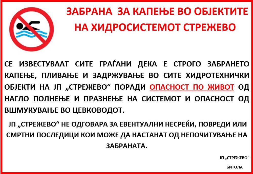 ЈП “Стрежево“ Битола: строга забрана за капење во објектите на хидроситемот