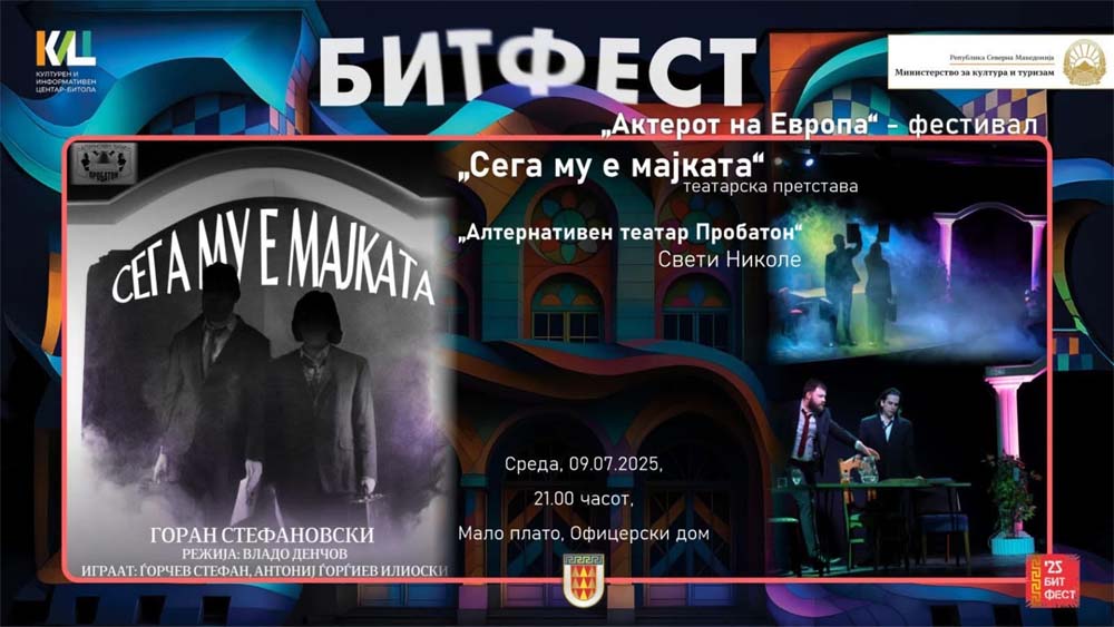 На 09.07.2025 (среда), со почеток од 21:00 часот, на Малото плато пред Офицерски дом во Битола ќе се одигра театарската претстава „Сега му е мајката“, во продукција на Алтернативен театар „Пробатон“ од Свети Николе.