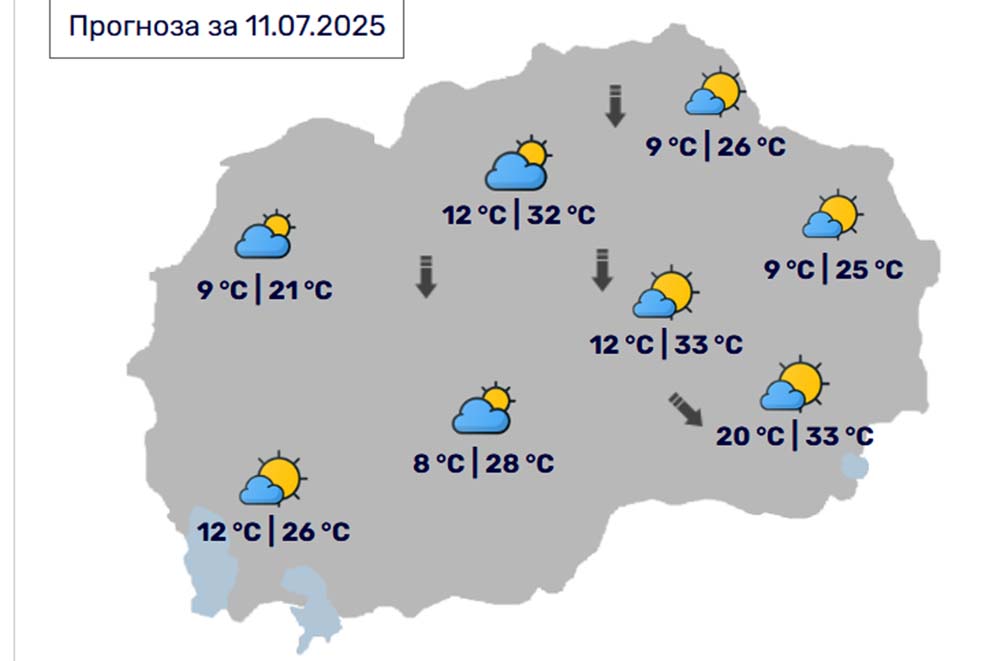 Денес, петок, 11 јули, во Битола според прогнозите на метеоролозите на Управата за хидрометеоролошки работи времето ќе биде сончево и посвежо со мала до умерена облачност. Ќе дува слаб до умерен ветер од северен правец. Температурата во Битола до 28 степени.