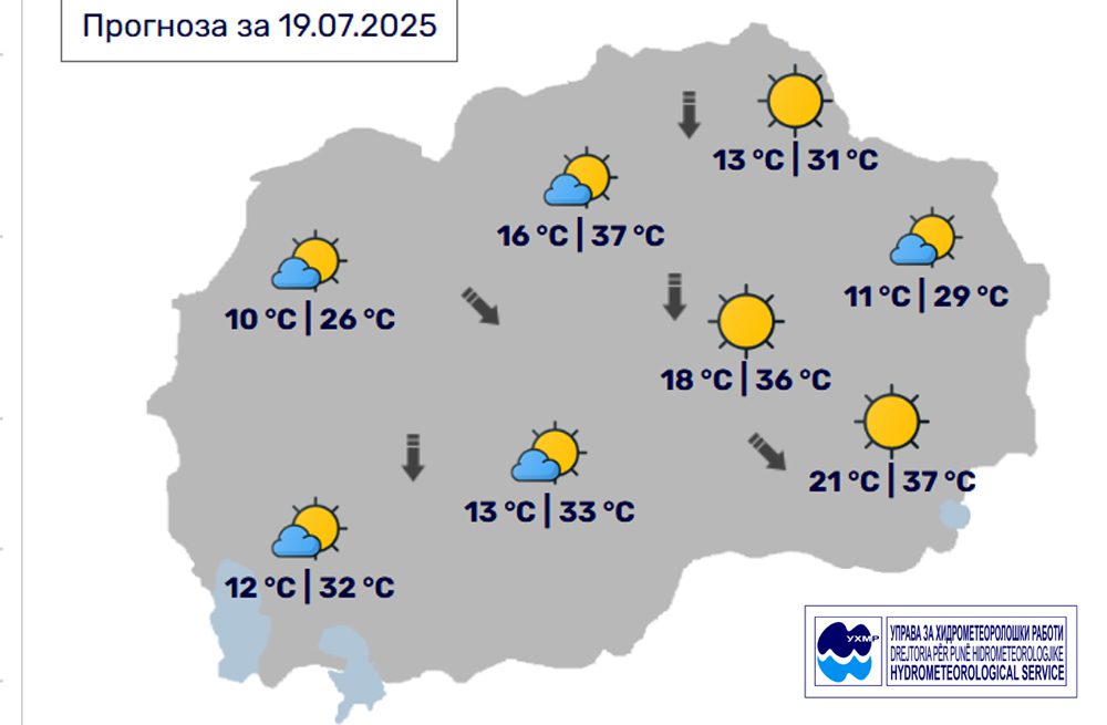 Денес, сабота, 19 јули, во Битола, според прогнозите на метеоролозите на Управата за хидрометеоролошки работи, времето ќе биде сончево и топло со мала до умерена локална облачност. Ќе дува слаб до умерен ветер од северен правец. Температурата во Битола до 33 степени.