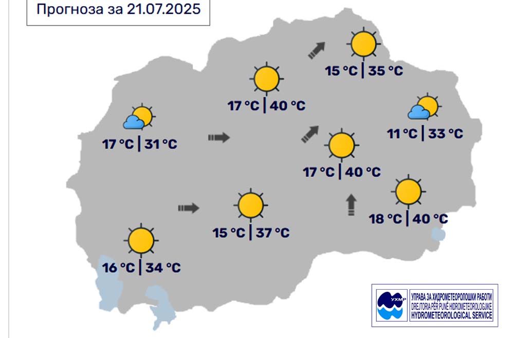 Денес, понеделник, 21 јули, во Битола, според прогнозите на метеоролозите на Управата за хидрометеоролошки работи, времето ќе биде сончево и многу топло со слаб до умерен ветер од западен и југозападен правец. Температурата во Битола до 37 степени.