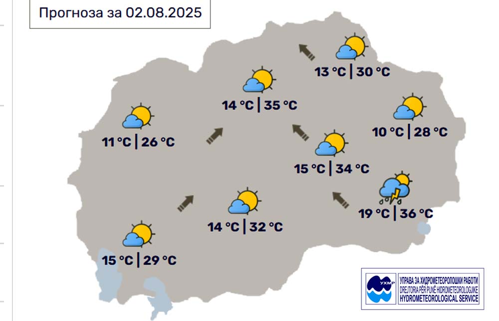Денес, сабота, 2 август, во Битола според прогнозите на метеоролозите на Управата за хидрометеоролошки работи, времето ќе биде сончево со мала до умерена облачност. Ќе дува слаб до умерен ветер од јужен правец. Температурата во Битола до 32 степени.