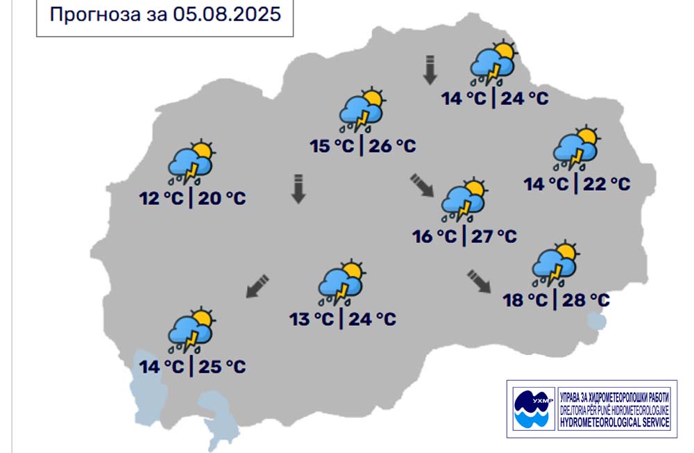 Денес, вторник, 5 август, во Битола, според прогнозите на метеоролозите на Управата за хидрометеоролошки работи, времето ќе биде променливо облачно и нестабилно со пороен дожд и грмежи. Температурата во Битола до 24 степени.