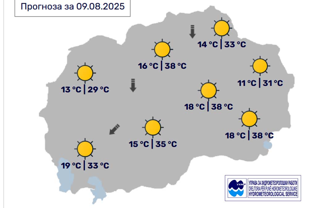 Денес, сабота, 9 август, во Битола, според прогнозите на метеоролозите на Управата за хидрометеоролошки работи, времето ќе биде сончево и многу топло со слаб до умерен ветер од северен и североисточен правец. Температурата во Битола до 35 степени.