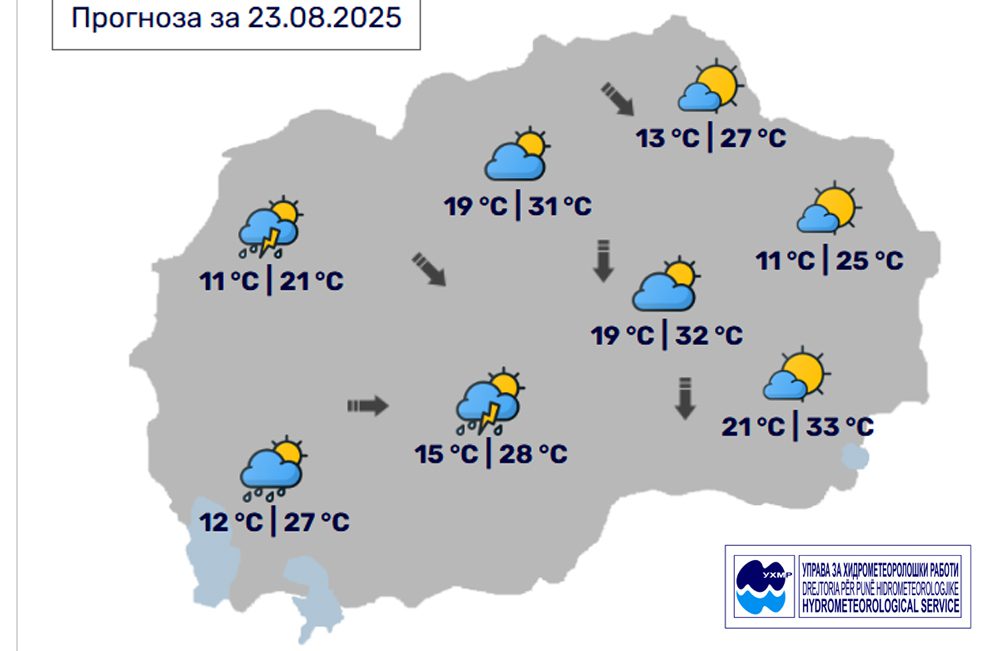 Денес, сабота, 23 август, во Битола, според прогнозите на метеоролозите на Управата за хидроетеоролошки работи, времето ќе биде променливо облачно со сончеви периоди, попладне можност за пороен дожд и ретки грмежи. Ќе дува слаб до умерен ветер од северен правец. Температурата во Битола до 28 степени.