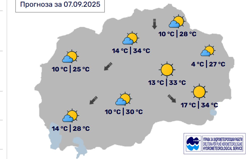Денес, недела, 7 септември, во Битола, според прогнозите на метеоролозите на Управата за хидрометеоролошки работи, времето ќе биде сончево и топло. Ќе дува слаб до умерен ветер од северен правец. Температурата во Битола до 30 степени.