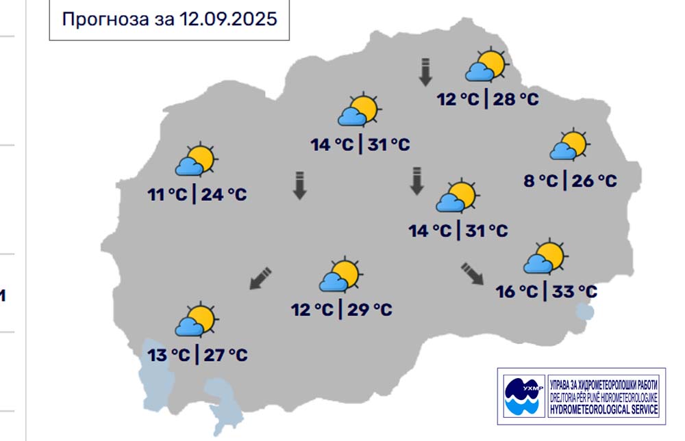 Денес, петок, 12 септември, во Битола, според прогнозите на метеоролозите на Управата за хидрометеоролошки работи, времето ќе биде сончево со мала до умерена облачност. Ќе дува слаб до умерен ветер од северен правец. Температурата во Битола до 29 степени.