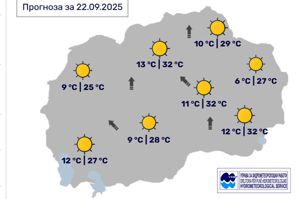 Денес, понеделник, 22 септември, во Битола, според прогнозите на метеоролозите на Управата за хидрометеоролошки работи, времето ќе биде по свежото утро, преку денот сончево и топло. Ќе дува слаб до умерен ветер од јужен правец. Температурата во Битола до 28 степени.