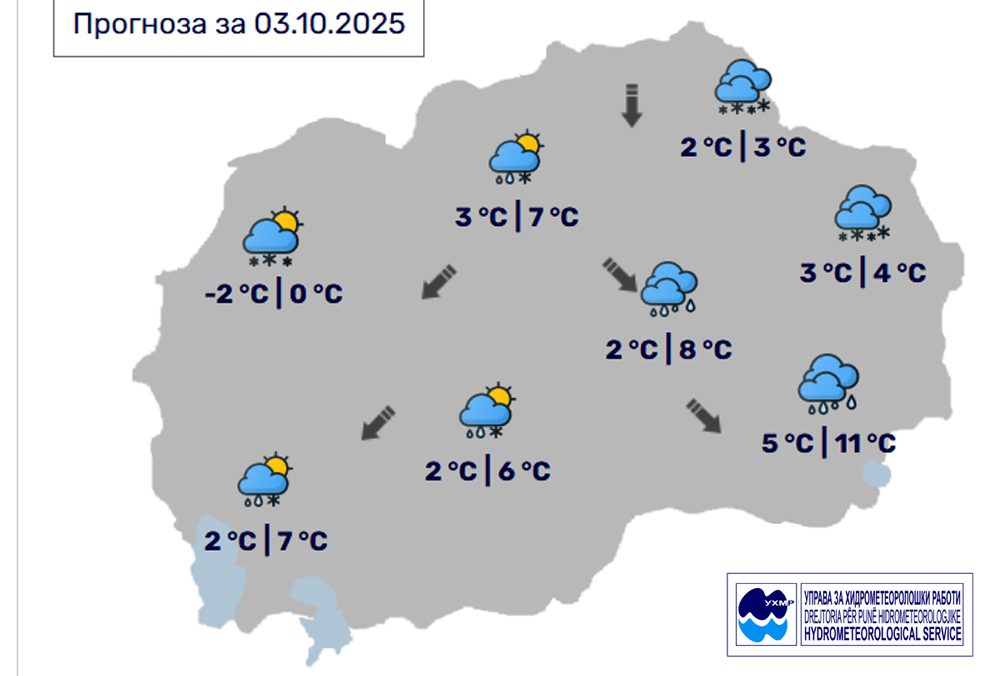 Денес, петок, 3 октомври, во Битола, според прогнозите на метеоролозите на Управата за хидрометеоролошки работи, времето ќе биде променливо облачно и студено со повремени врнежи од дожд. Попладне врнежите ќе престанат. Ќе дува умерен до засилен северен ветер. Температурата во Битола до 6 степени.