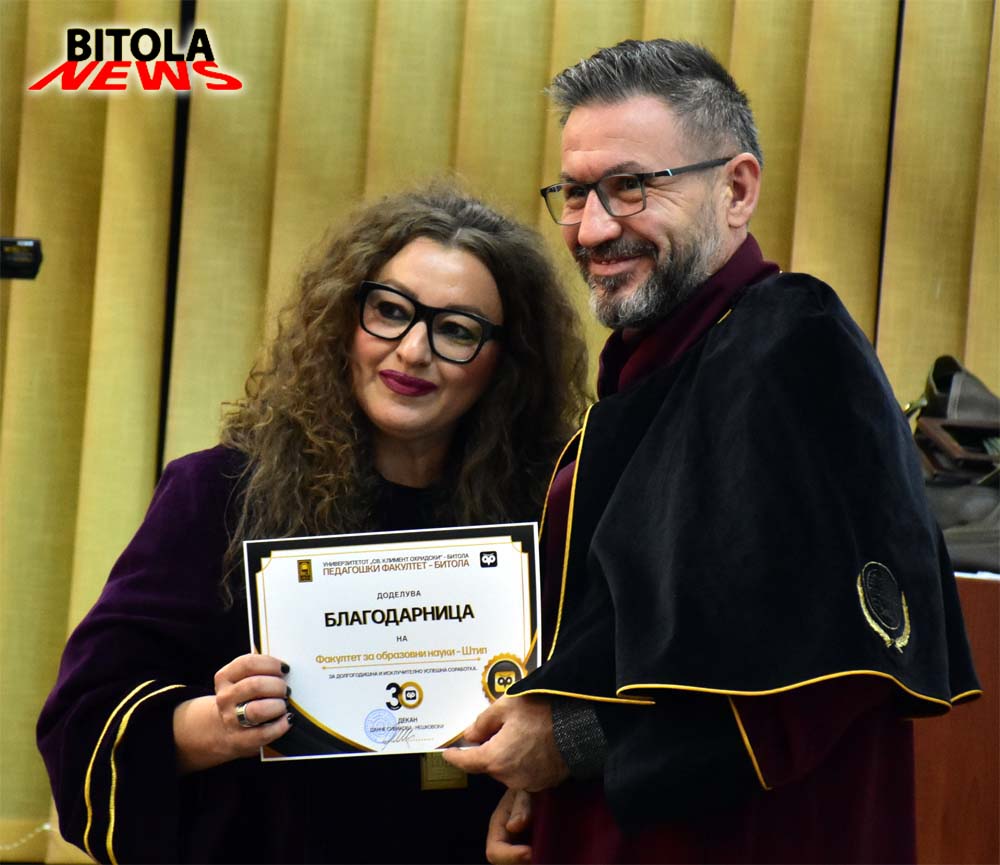 Денеа во анфитеатарот на Педагошки факултет во Битола беше одржана свечена академија со која беа одбележан јубилејот од 30 години од основањето на Педагошкиот факултет при Универзитетот „Св. Климент Охридски“ – Битола и Светскиот ден на учителот.На свечената академија присуствуваше ректорот на УКЛО – проф. д-р Игор Неделковски, претседателот на Сенатот на УКЛО – проф. д-р Филип Поповски, градоначалниците на Битола – Тони Коњановски, на Новаци – Стевче Стевановски, деканите на единиците на УКЛО, претстаници на унуверзитетот “Гоце Делчев“ од Штип, претставици на основните и средните училипте од Битола, на детските градинки…Ректорот на УКЛО – проф. д-р Игор Неделковски рече:-Овој факултет е мој иако не студирав тука, а ќе кажам зошто. Мојата учителка имаше завршено “ВеПеШе“ таа ме описмени. Учителките на моите синови ги описменија учителки кои има завршено Педагошки факултет. Вие сега, и вашите претходници ги имате описменето ова општестви, тоа навистина е нешто што треба да се гордеете, на вашите корени, односно напите корени се многу подлабоки. Овој универзитет е наследник на најголемиот словенски учител Св. Климент Охридски. Гордо да го носиме неговото име, а ние како установа што едуцира учители имате потполно право да речите дека ја продолжувате просветителската мисија на Св. Климент Охридски. Затоа ви благодарам, и Ви го честитам јубилејот.Деканката на Педагошкиот факултет Битола проф. д-р Данче Сивакова Нешковски во своето обраќање рече:-Како деканка имам привилегија да ја водам оваа институција токму во годината кога славиме голем јубилеј – 30 години од основањето на факултетот. Моето задоволство е уште поголемо бидејќи ова чествување се совпаѓа со нашата шеста меѓународна конференција Education across Borders – REMA: Reimagining Education in the Modern Age, како и со Светскиот ден на учителот, 5 октомври. Педагошкиот факултет во Битола има богата и плодна историја. Тој ги продолжува традициите на прочуената Учителска школа и  Педагошката академија, а од 1995 година се разви во Факултет за учители и воспитувачи со четиригодишни студии и продуцира кадар кој е способен за современа настава, насочена кон развој на индивидуалните потенцијали на децата и младите и кон градење активно граѓанство кое придонесува за општествениот развој. Факултетот го развиваме во насока на зачувување на нашите силни страни, подобрување на слабостите, искористување на можностите и минимизирање на заканите. Се грижиме транспарентно да го прикажеме нашето функционирање пред студентите, академската заедница и пошироката јавност. Накратко, нашиот факултет е заедница што негува култура на квалитет на сите нивоа и создава академска средина во која акцентот се става на науката, знаењето и универзалните човечки вредности.Градоначникот на Битола, Тони Коњановски рече:-Во овие триесет години, Педагошкиот факултет се градеше и се развиваше во реномирана високообразовна установа која игра клучна улога во воспитно-образовниот систем на нашата држава. Од неговите клупи излегоа илјадници наставници, воспитувачи, педагози и едукатори кои и до ден денес го пренесуваат своето знаење во училиштата и градинките низ целата земја, оформувајќи генерации млади луѓе, градејќи темели на современо, одговорно и хумано општество.  Учителската професија е една од најодговорните и највред