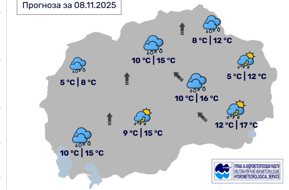 Денес, сабота, 8 ноември, во Битола, според прогнозите на метеоролозите на Управата за хидрометеоролошки работи, времето ќе биде променливо облачно со повремени врнежи од дожд. Ќе дува умерен, повремено засилен ветер од јужен правец. Температурата во Битола до 15 степени.