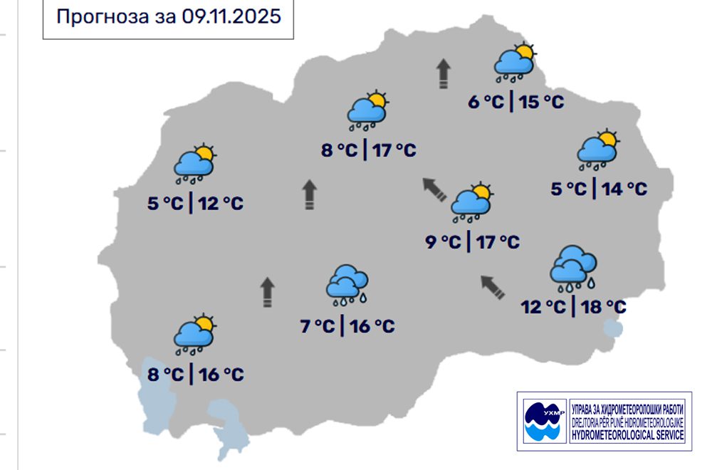 Денес, недела, 9 ноември, во Битола, според прогнозите на метеоролозите на Управата за хидрометеоролошки работи, времето ќе биде променливо облачно со повремени врнежи од дожд. Ќе дува слаб до умерен ветер од јужен правец. Температурата во Битола до 16 степени.