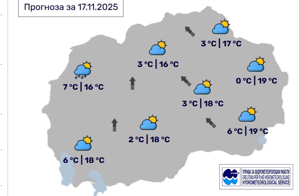 Денес, понеделник, 17 ноември, во Битола, според прогнозите на метеоролозите на Управата за хидрометеоролошки работи, времето ќе биде променливо облачно со сончеви периоди. Ќе дува умерен до засилен ветер од јужен правец (над 60 km/h). Температурата во Битола до 18 степени.