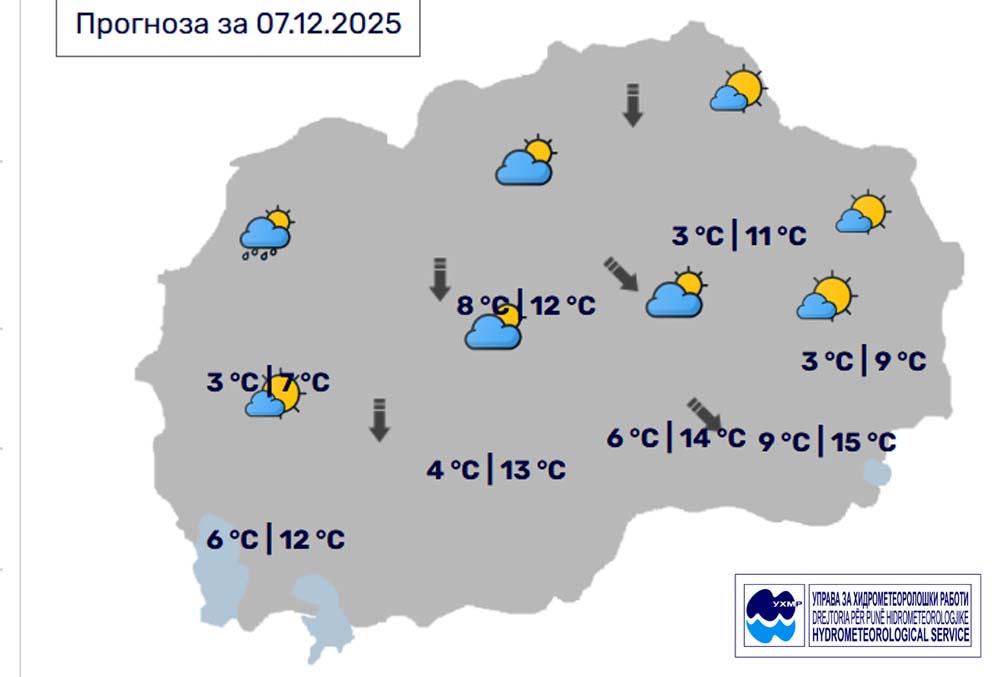 Денес, недела, 7 декември, во Битола, според прогнозите на метеоролозите на Управата за хидрометеоролошки работи, времето ќе биде променливо облачно со сончеви периоди. Ќе дува слаб до умерен ветер од северен правец. Температурата во Битола до 13 степени.