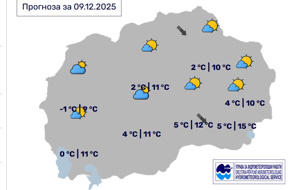 Денес, вторник, 9 декември, во Битола, според прогнозите на метеоролозите на Управата за хидрометеоролошки работи, времето ќе биде сончево со мала до умерена облачност. Ќе дува слаб до умерен ветер од северозападен правец. Температурата во Битола до 11 степени.