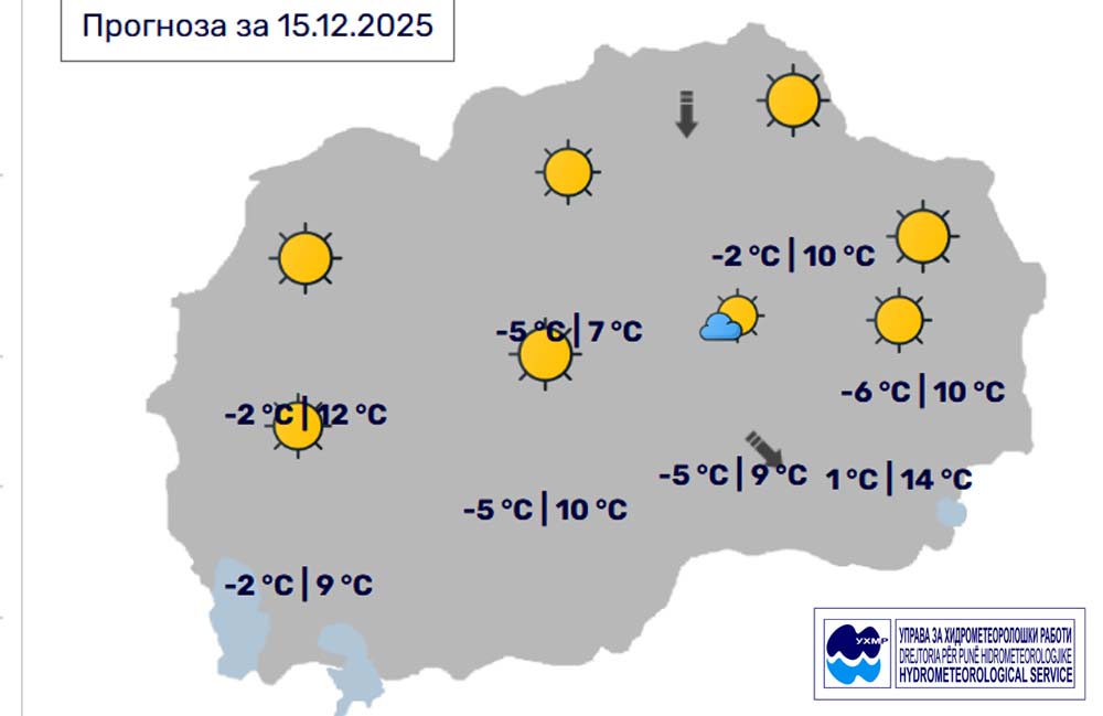 Денес, понеделник, 15 декември, во Битола, според прогнозите на метеоролозите на Управата за хидрометеоролошки работи, времето ќе биде сончево. Ќе дува слаб ветер од северозападен правец. Температурата во Битола до 10 степени.