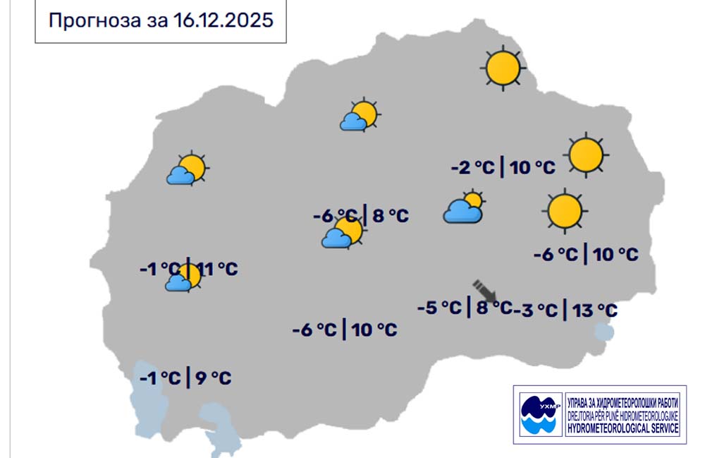 Денес, вторник, 16 декември, во Битола, според прогнозите на метеоролозите на Управата за хидрометеоролошки работи, времето ќе биде сончево и претежно тивко со облачност. Температурата во Битола до 10 степени.
