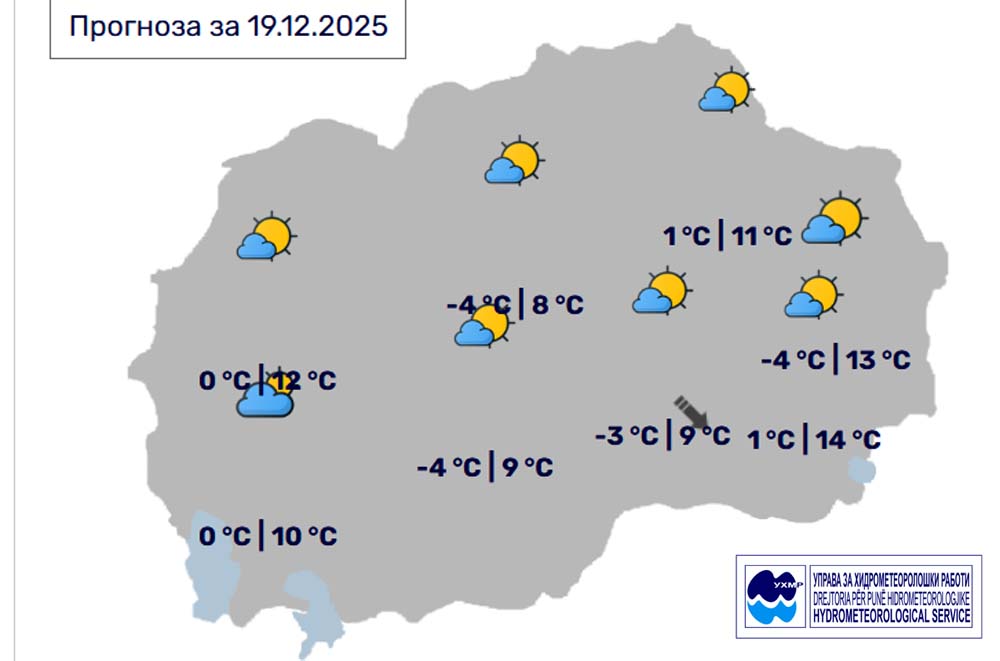 Денес, петок, 19 декември, во Битола, според прогнозите на метеоролозите на Управата за хидрометеоролошки работи, времето ќе биде сончево со мала до умерена облачност. Температурата во Битола до 9 степени.