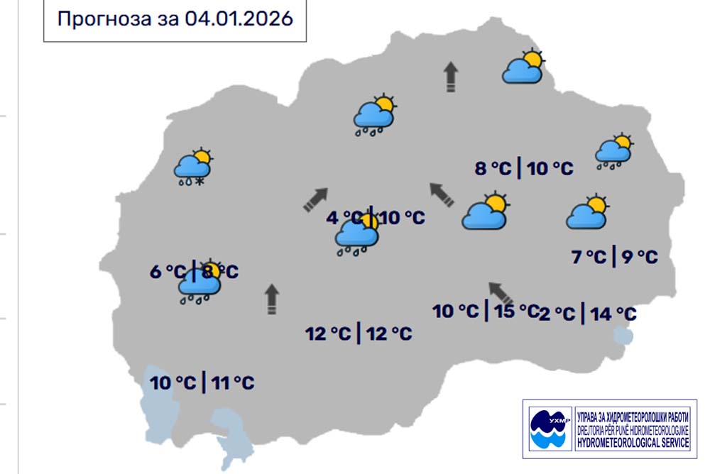 Денес, недела, 4 јануари, во Битола, според прогнозите на метеоролозите на Управата за хидрометоролошки работи, времето ќе биде променливо облачно со повремен дожд. Ќе дува умерен ветер од јужен правец. Температурата во Битола до 12 степени.