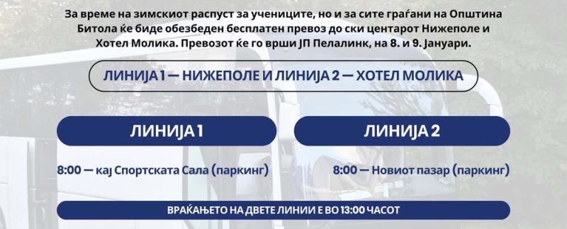 Општина Битола и јавното претпријатие „Пелалинк“ и оваa зима за време на зимскиот распуст за учениците, но и за сите граѓани ќе обезбеди бесплатен превоз до ски центрите на Баба Планина.