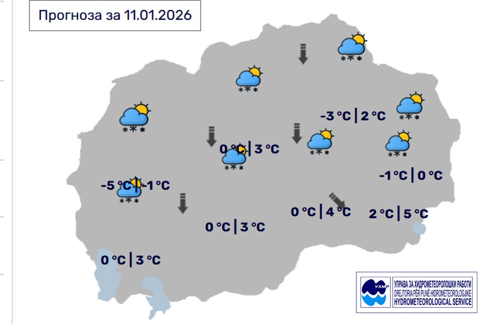 Денес, недела, 11 јанаури, во Битола, според прогнозите на метеоролозите на Управата за хидрометеоролошки работи, времето ќе биде променливо облачно и студено, претпладне со повремени локални врнежи од снег, попладне врнежите ќе престанат. Ќе дува умерен ветер од северен правец. Температурата во Битола до 3 степени.