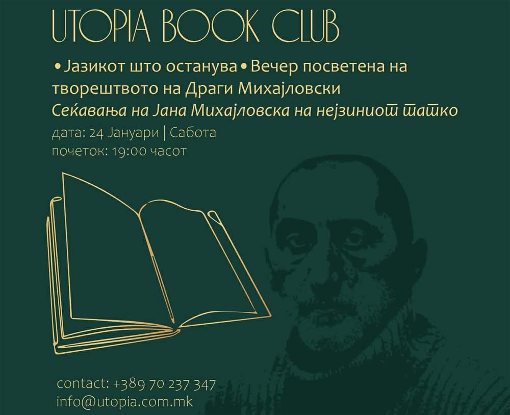 Книжевниот клуб Утопија во Битола вечерва, 24 јануари, организира специјална книжевна средба посветена на животот и делото на Драги Михајловски – еден од најзначајните македонски писатели и преведувачи, автор чиј придонес кон македонскиот јазик и книжевност има трајна, трајна вредност. Оваа вечер не е комеморација, туку жива средба со едно дело што продолжува да зборува. Разговор за јазикот како одговорност, за преводот како авторски чин и за книжевноста како тивка, но длабока работа што остава трага далеку подолго од моментот во кој е создадена.