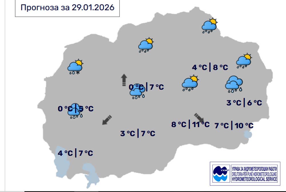 Денес, четрток, 29 јануари, во Битола, според прогнозите на метеоролозите на Управата за хидрометеоролошки работи, времето ќе биде променливо облачно со повремени локални врнежи од дожд. Ќе дува слаб ветер претежно од северозападен превец. Температурата во Битола до 7 степени.