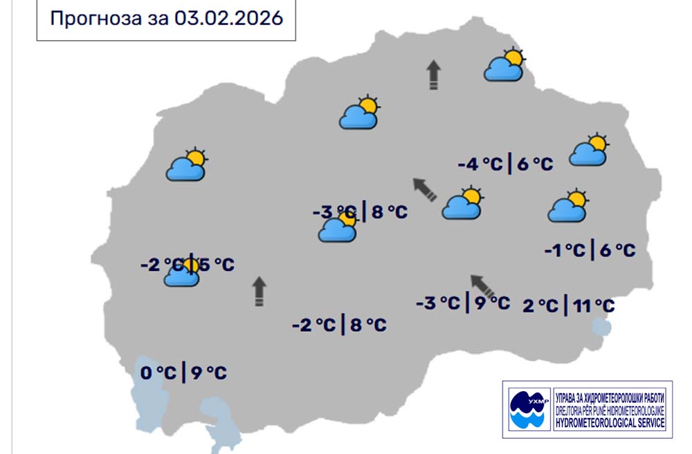 Денес, вторник, 3 фавруари, во Битола, според прогнозите на метеоролозите на Управата за хидрометеоролошки работи, времето ќе биде променливо облачно со сончеви периоди. Ќе дува слаб ветер од југоисточен правец. Температурата во Битола до 8 степени.