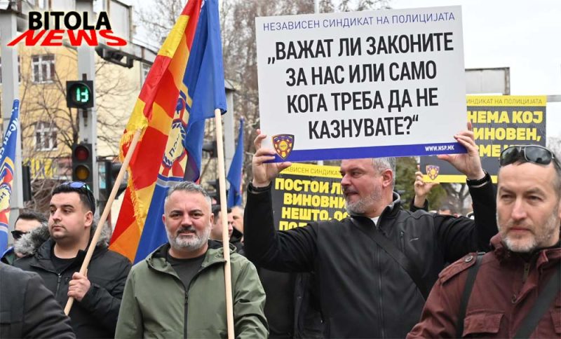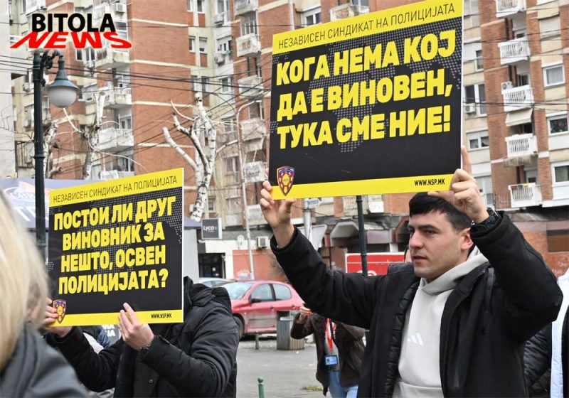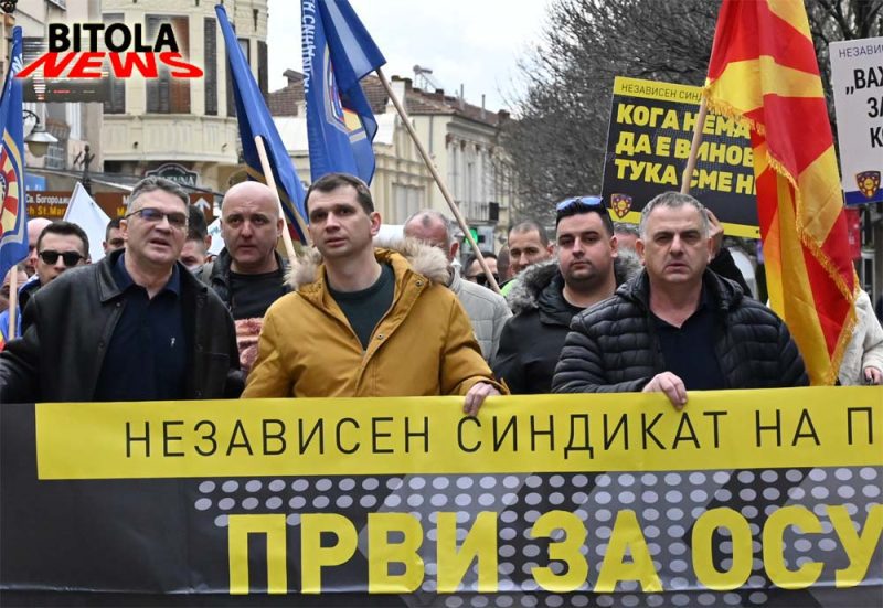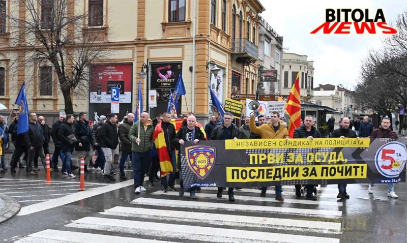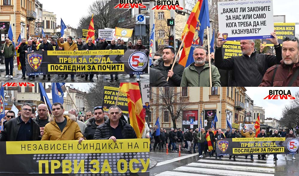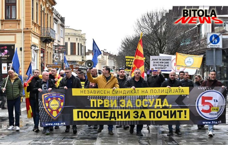 Членови на независниот синдикат на полицијата (НСП) денес во Битола организираше протест имирен марш што започна од пред Основното јавно обвинителство  по Широк Сокак до плоштадот „Магнолија“ во Битола. Повод за маршот се последните јавни закани и настани во Битола, каде што поединци се закануваа со насилство кон полициски службеници доколку тие ги спроведуваат законите. Апелираме законите да важат подеднакво за сите – граѓани, полиција и институции,  соопшти НСП.Мартин Ефремов, претседател на независниот синдикат рече: -Го организираме овој протестен марш во Битола со цел да ја актуелизираме состојбата која што од пред неколку дена полека се подзаборава, а тоа се заканите кои што ни беа упатени и за напади и за убиства на полициски службеници доколку продолжиме да го спроведуваме законот. Мислиме дека овие закани треба државата апсолутно да ги сфати зошто секоја закана и напад врз полициски службеник треба единствено да се гледа како напад врз државата. Сметаме дека само ако така поминеме врз ова, тоа утре ќе се повтори и врз судии, обвинители, новинари, и дека мора да има посериозни и поригоризни казни. Извинувањето не е правда и мора да има притвор за лицата и да следи кривична постапка. Бараме државата да поработи на превенција и да се вратат казните да се вратат на 1.000 евра.Владимир Литовски, помошник генерален секретар на НСП, додаде:-Ова не е протест само за полицајците туку и за сите службени лица и за сите граѓани на Македонија, поради тоа што ваквите навреди и закани не смеат да се толерираат никако. Казните мора да се зголемат, да бидат построги парично и да има затворски казни за да имаме правна држава.На протестот зборуваше и Горан Ристевски претедател на грански синдикат, независон синдикат на администрација на Македонија кој рече:-Пред институциите и улиците низ Битола протестираме за каде што законот ќе важи подеднакво за сите, без разлика дали се работи за полицајци, граѓани или институции и го поставуваме прашањето, кој го штити оној кој го спровесува почитувањето на законот. Целта на маршот не е насочена против ниту една етничка, социјална или друга заедница, туку е јасен апел и крик за потребата од владеење на правото. Барањата упатени на маршот се итна измена на Законот за прекршоци против јавниот ред и мир, односно враќање на поранешната глоба од 1.000 евра за омаловажување на државни органи и полициски службеници, наместо сегашните казни од 50 до 150 евра.Од НСП додаваат и дека протестите ќе продолжат се до исполнување на барањата.