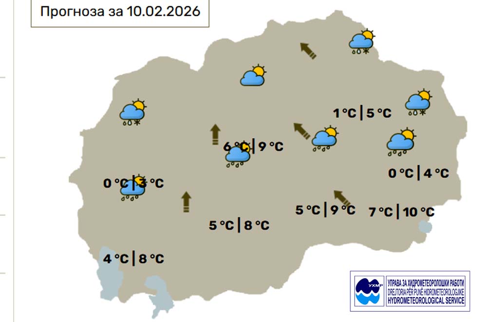 Денес, вторник, 10 февруари, во Битола, според прогнозите на метеоролозите на Управата за хидрометеоролошки работи, времето ќе биде променливо облачно со повремен дожд. Ќе дува слаб до умерен ветер од југоисточен правец. Температурата во Битола до 8 степени.