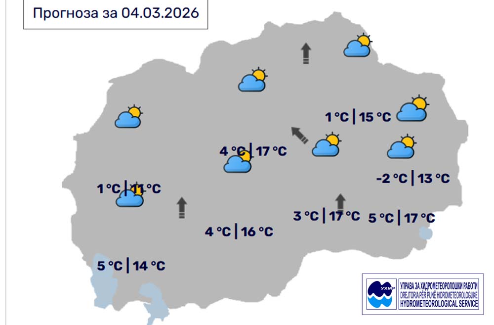 Утре, четврток, 5 март, во Битола времето ќе биде променливо облачно со повремени локални врнежи од дожд, особено попладне и кон крајот на денот. Ќе дува умерен ветер од северозападен правец. Температурата во Битола до 16 степени.