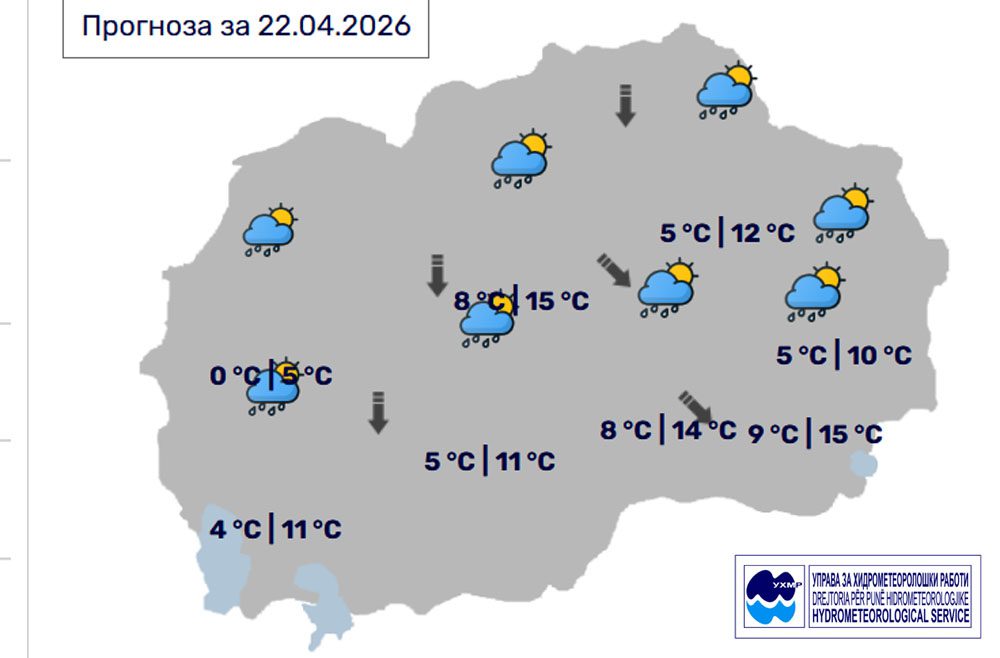 Денес, среда, 22 април, во Битола, според прогнозите на метеоролозите на Управата за хидрометеоролошки работи, времето ќе биде променливо облачно со повремени врнежи од дожд. Ќе дува слаб до умерен ветер од северен правец. Температурата во Битола до 11 степени.