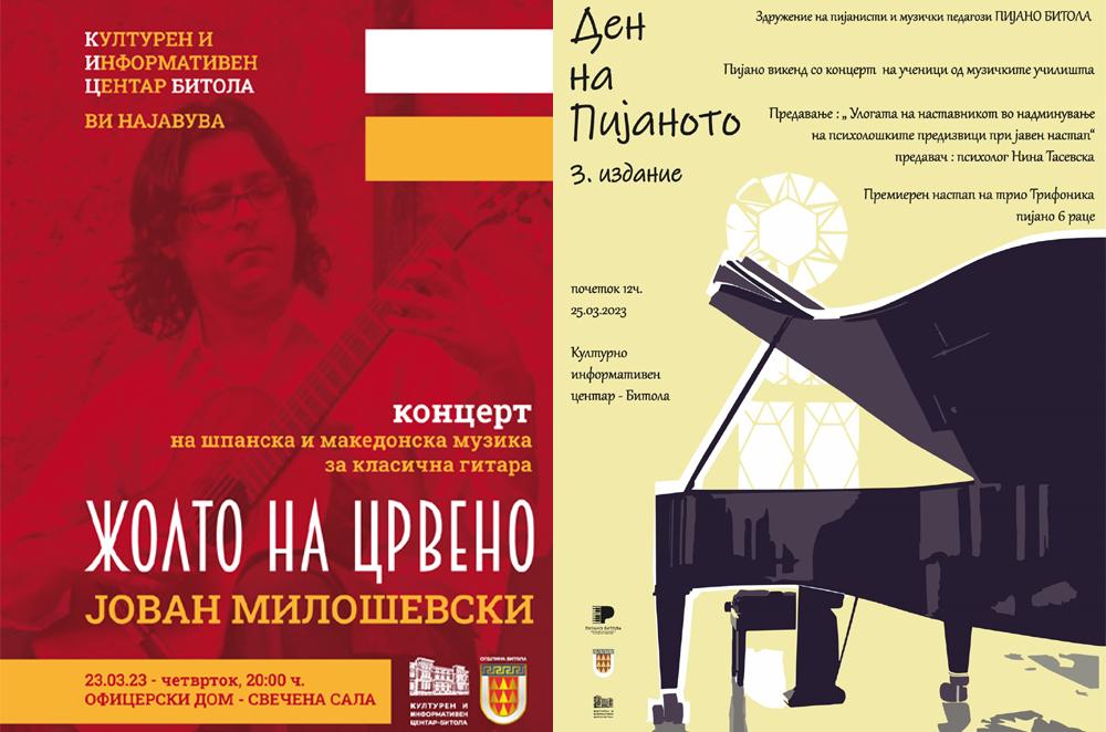 ЈОУ Културен и информативен центар Битола со поддршка на Општина Битола најави два музички настани кои ќе се одржат во Офицерски дом во Битола.