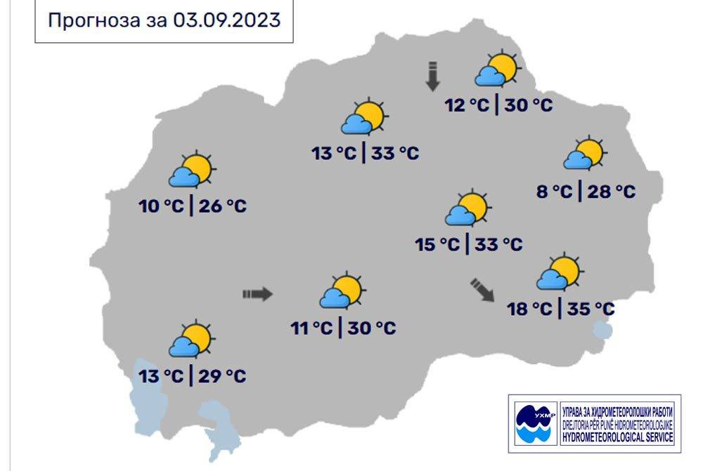 Утре, понеделник, 4 септември во Битола времето ќе биде променливо облачно и значително свежо со врнежи од дожд, кои на места ќе бидат поројни и проследени со грмежи. Ќе дува умерен до засилен северен ветер. Температурата во Битола до 22 степени. УВ=5.