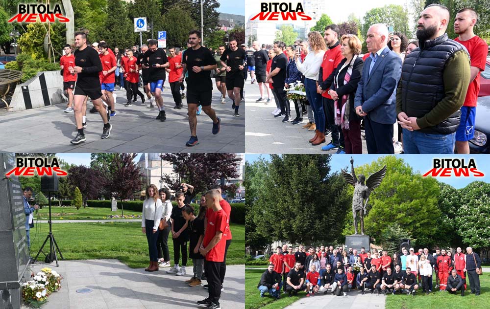 Пред почетокот на трката младите членовите на “Букефал“ положија цвеќе на споменикот “Ангел“ во паркот кај градскиот часовник.