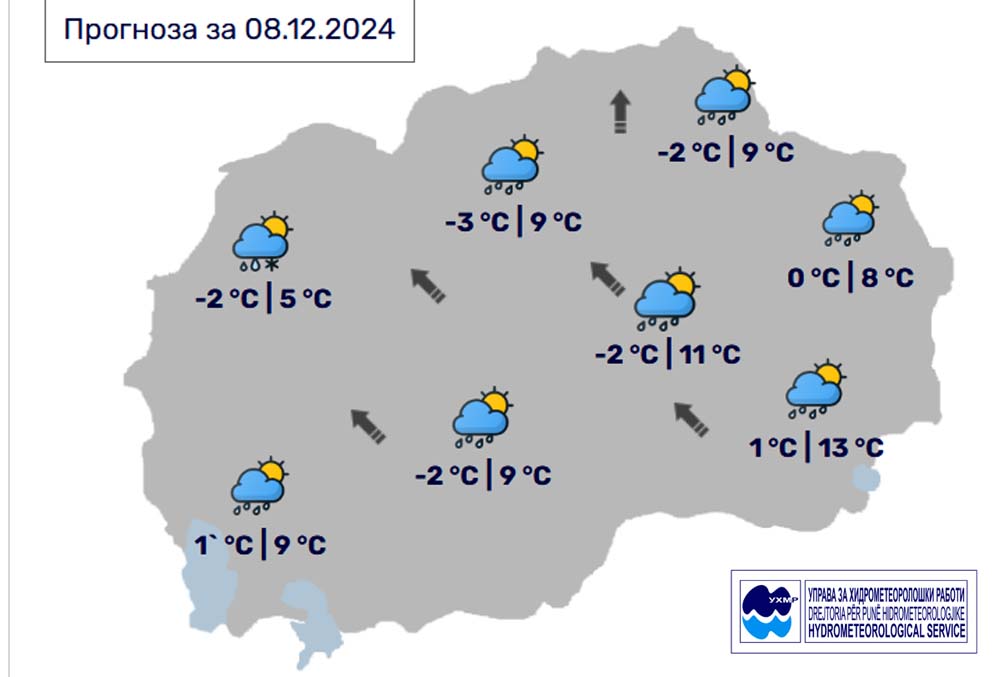 Денес, недела, 8 декември, во Битола според прогнозите на метеоролозите на Управата за хирометеоролошки работи, времето ќе биде променливо облачно со сончеви периоди. Попладне и во текот на ноќта ќе има врнежи од дожд. Ќе дува слаб до умерен ветер од југоисточен правец. Максималната температура во Битола ќе биде до 9 степени.