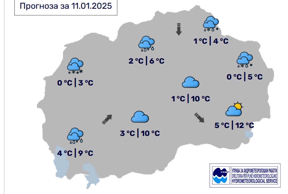 Утре, недела, 12 јануари времето во Битола ќе биде облачно и студено со врнежи претежно од снег. Ќе дува слаб до умерен ветер од северен правец.